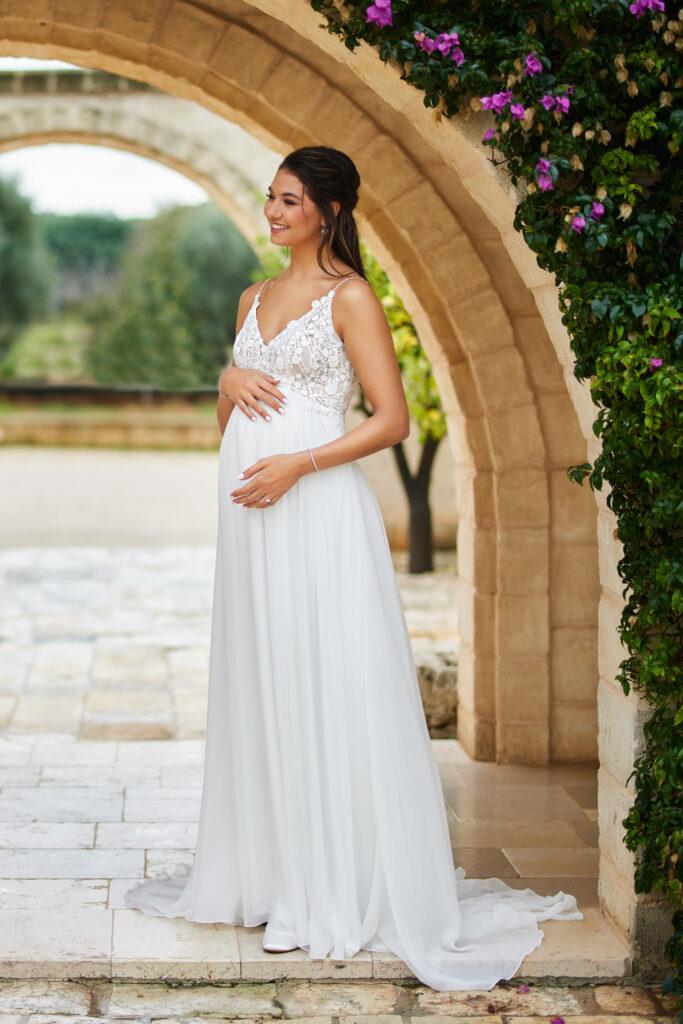 Hier gibt es Kleider für die rundumglücklich schwangere Braut! Natürlich kommt es immer darauf an, wie schwanger die Braut schon ist und wann die Hochzeit stattfindet. Bis dahin kann sich oft noch einiges verändern. Manche Kleider sind ausgewiesene Umstandsbrautkleider, andere lassen sich in den meisten Fällen bei der Schneiderin anpassen.